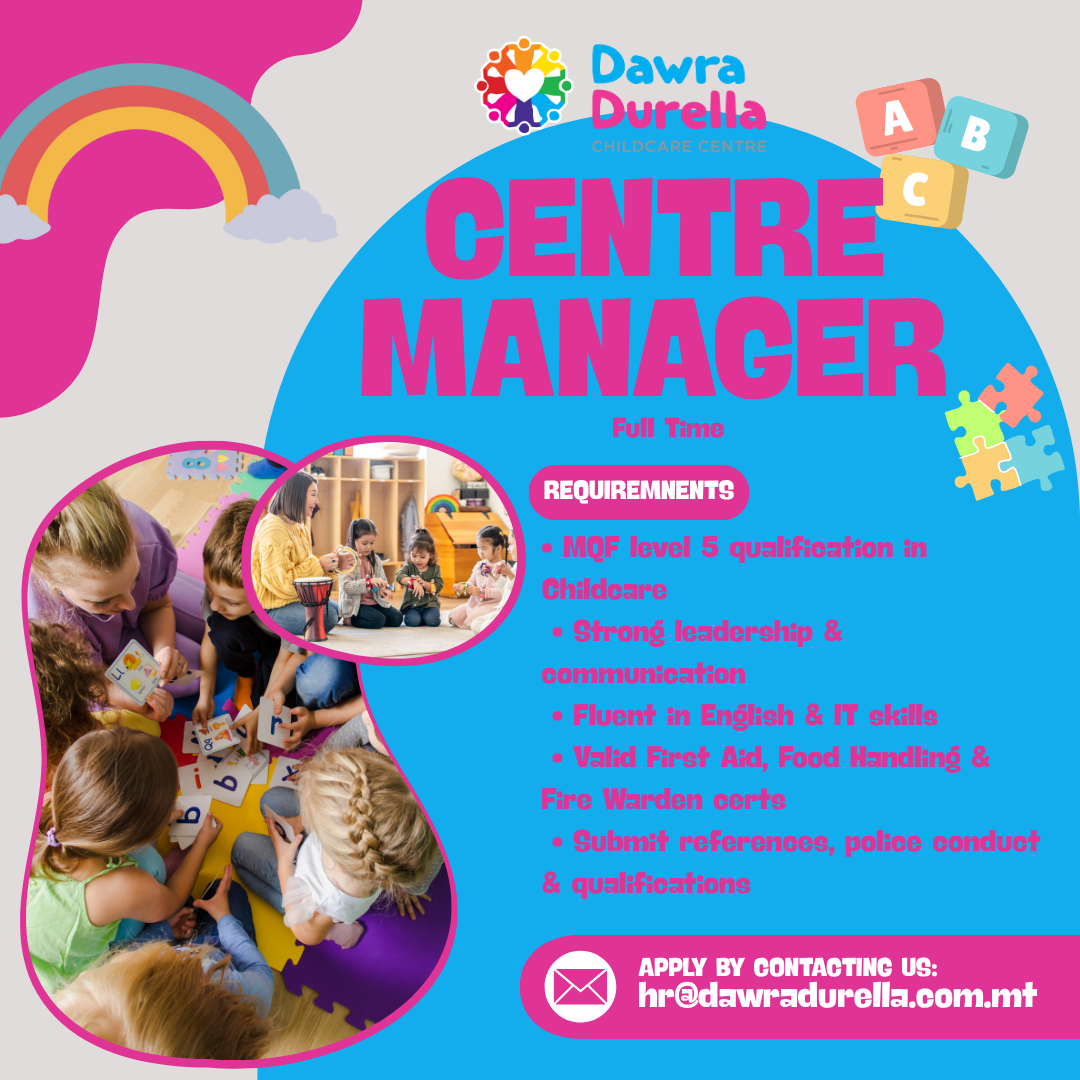 Send your CV, cover letter, references, police conduct & qualifications to: hr@dawradurella.com.mt